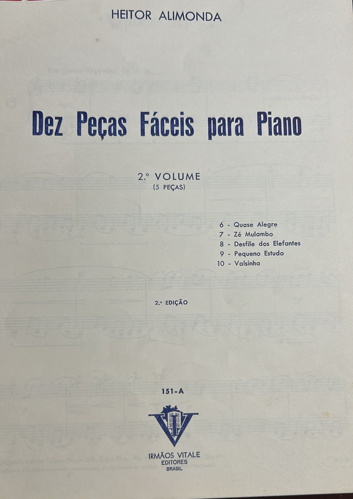 Coleção 'Dez Peças Fáceis para Piano Vol. 2 (5 Peças)' de Heitor Alimonda para Piano. Contém: 6- Quase Alegre 7- Zé Mulambo 8- Desfile dos Elefantes 9- Pequeno Estudo 10- Valsinha. AUTOR: Heitor Alimonda FORMATO: Partitura / 9 páginas INSTRUMENTO: Piano IDIOMA: Português EDITORA: Vitale