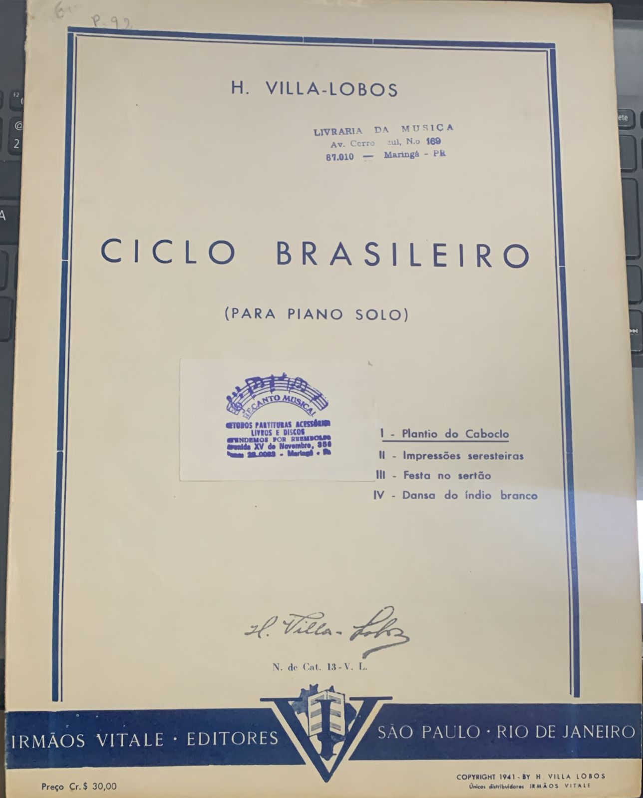 Partitura para piano da música: PLANTIO DO CABOCLO (N° 1 da coleção Ciclo Brasileiro) de Villa-Lobos.